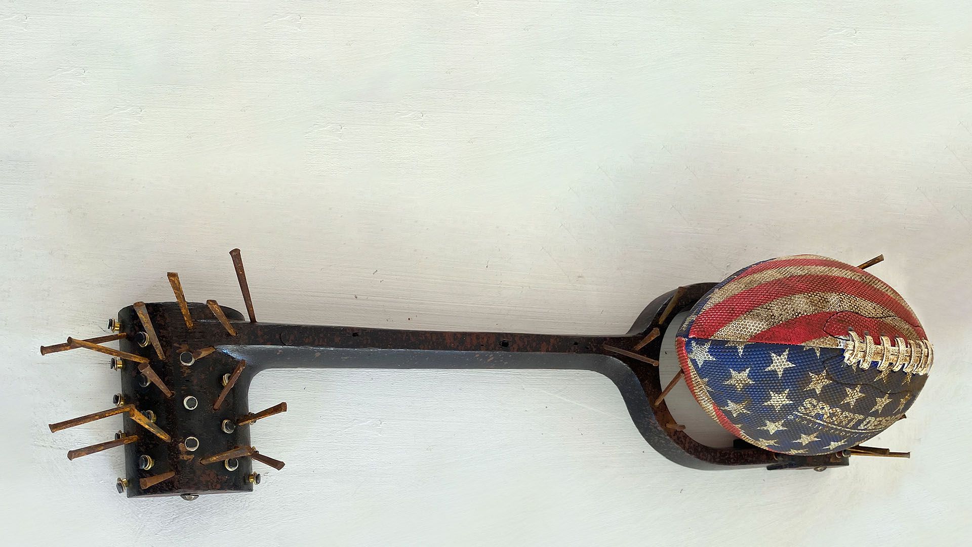 Jones’ paintings are comprised of the rended covers of books whose purpose is to influence, educate, and inform. In his effort to investigate omissions and falsehoods deeply embedded within these volumes, Jones sews the book covers back together to create uncannily beautiful abstract paintings, often at a large scale.