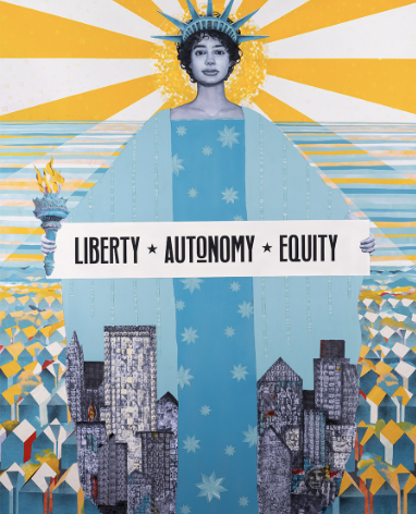 Niki Johnson: Pillars of Democracy is an exhibition of four large-scale collaged portraits envisioning Lady Liberty, Justice, Freedom, and Forward progress, showcasing the central role of women in the democratic process–from early 20th century suffragists to first-time voters today–uniting generations of creative resistance. This work is traveling throughout the midwest in conjunction with the League of Women Voters and serves to honor the enduring power of the vote and the way art advances movements of change.